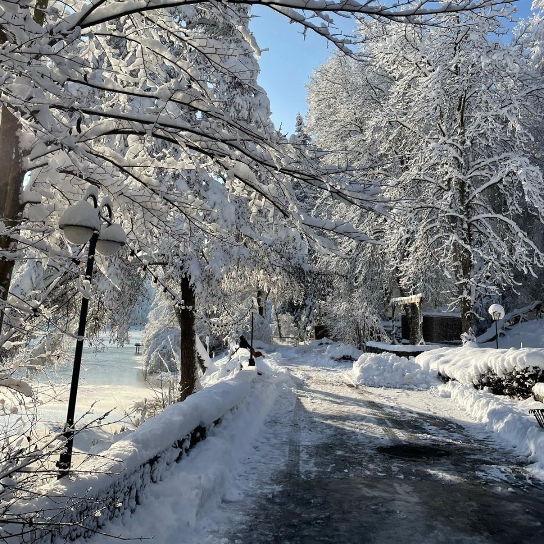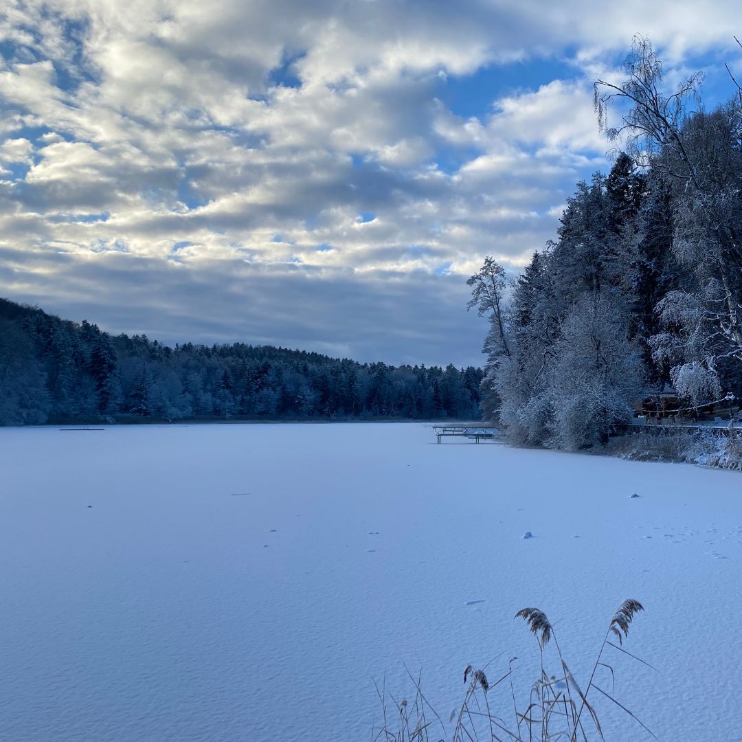 Schnee liegt auf den Wegen, der See ist gefroren und still, die Luft klar – und alles fühlt sich ein kleines bisschen magisch an.